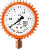 Газовый (сварочный) манометр серии МП2-Уф отечественного производства АО «ПО Физтех» используется для измерения и контроля давления газа в замкнутой системе с максимальной рабочей температурой до 120°C. Его запрещается использовать в работе с агрессивными, вязкими и кристаллизующимися рабочими средами. Применяется в баллонных редукторах и регуляторах. Прибор имеет диаметр корпуса 50 мм, радиальное исполнение (штуцер снизу), класс точности 2,5 и степень защиты IP40. Корпус газового манометра от Физтех имеет цветовую индикацию в зависимости от измеряемой среды: кислородный (О2) манометр – синий; ацетиленовый (С2Н2) манометр – белый; пропановый (С3Н8) манометр – красный. Прибор может поставляться с красной регулируемой стрелкой на стекле и с защитным кожухом (это доп. опция).